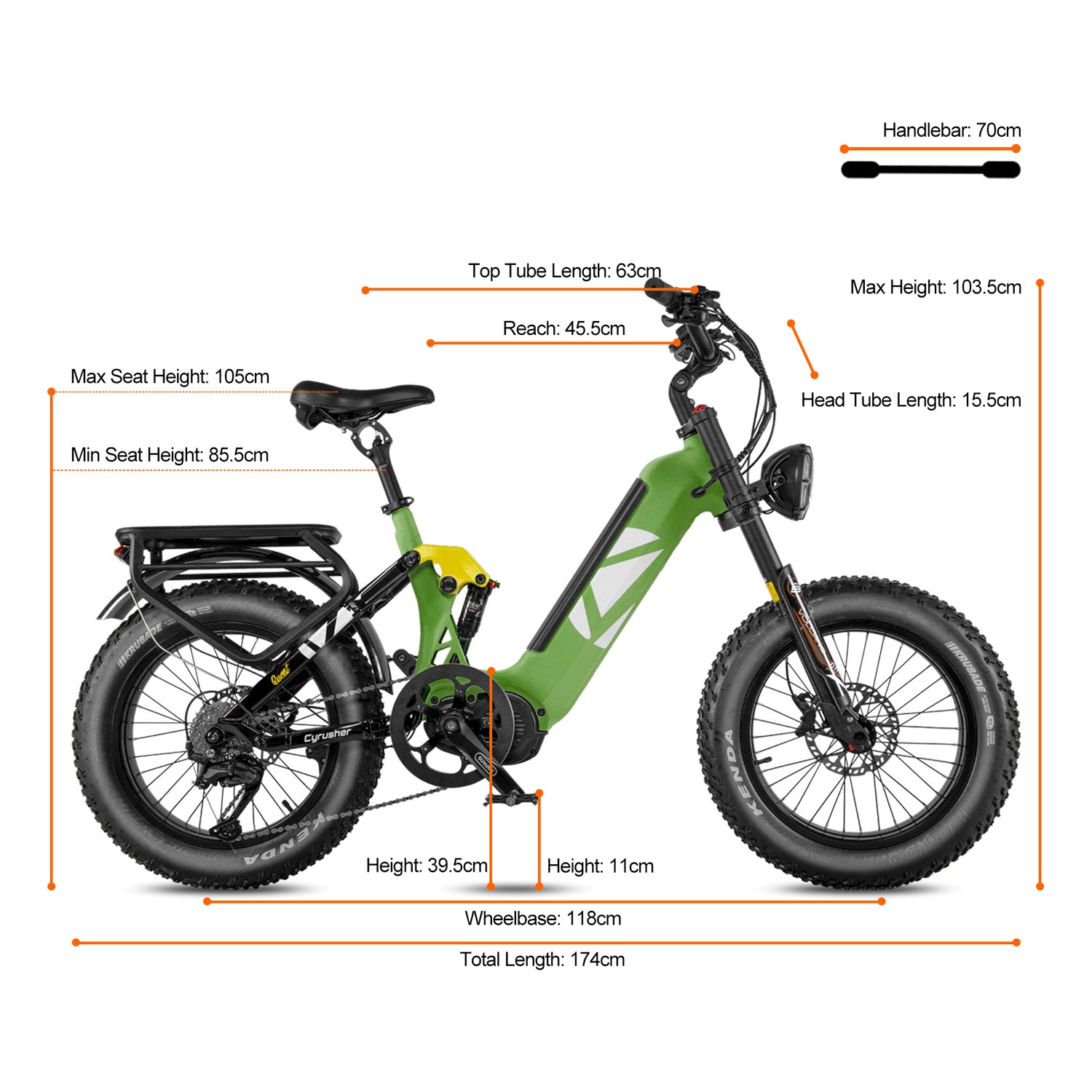 The Cyrusher Quest is the first 20-inch step-through e-bike with a mid-drive motor and full suspension. With a powerful Bafang M620 motor, 48V20Ah battery, and a 80miles range, it offers a thrilling and smooth ride on any terrain, making every journey an adventure.